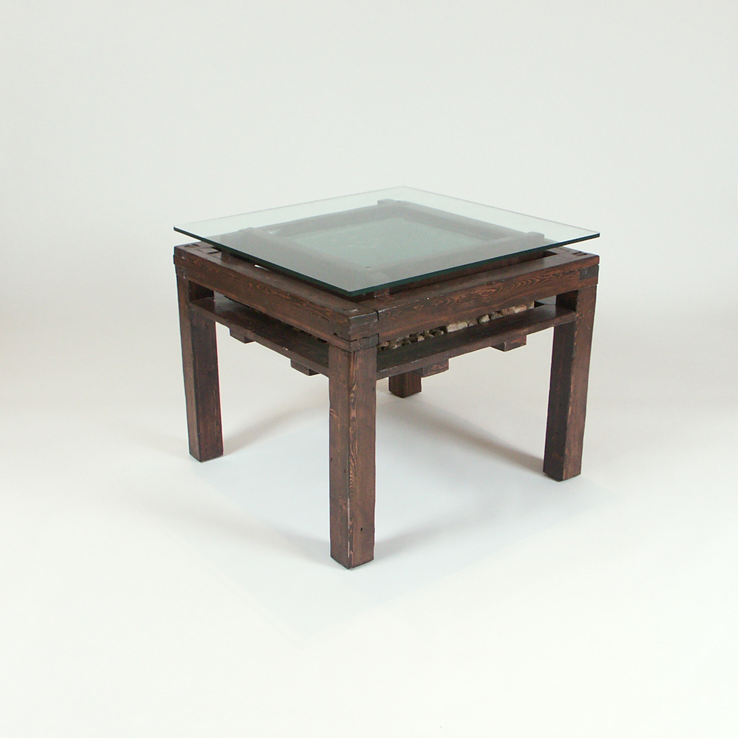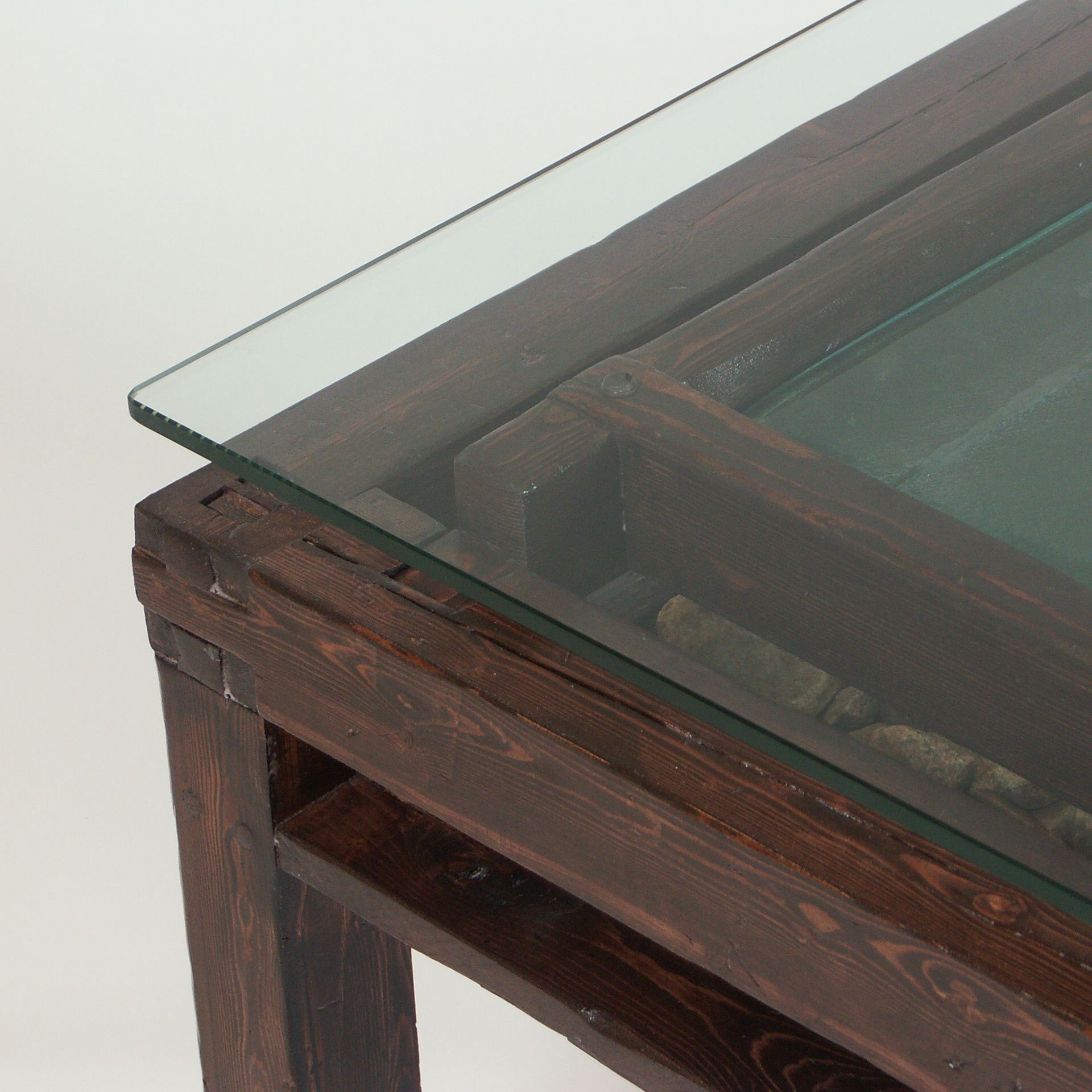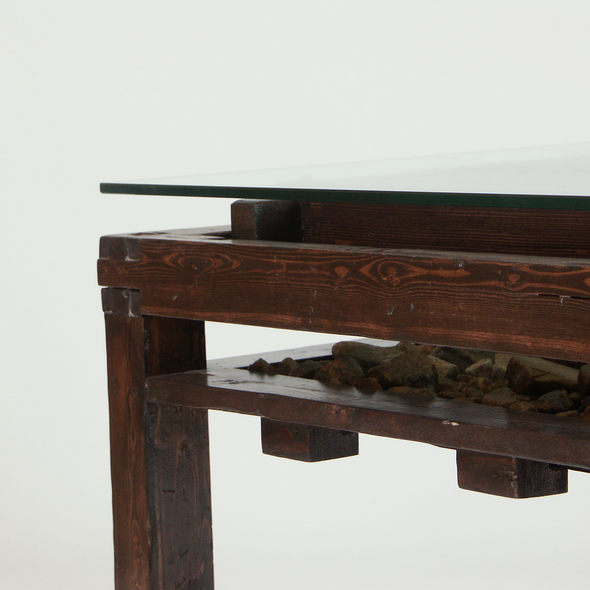 Reclaimed wood (pine), river stones, melted glass, glass top