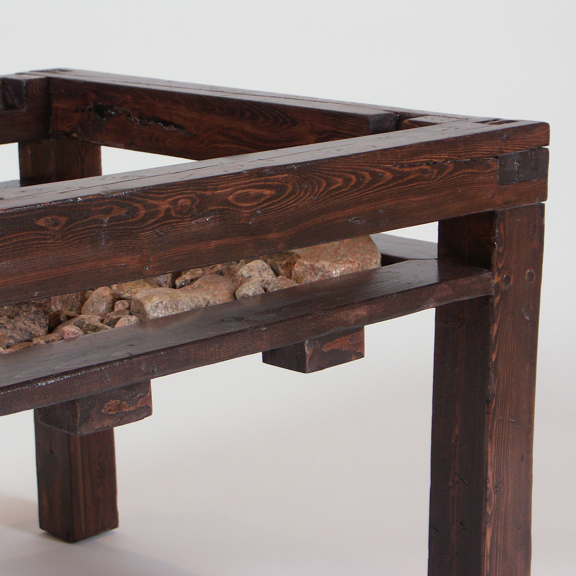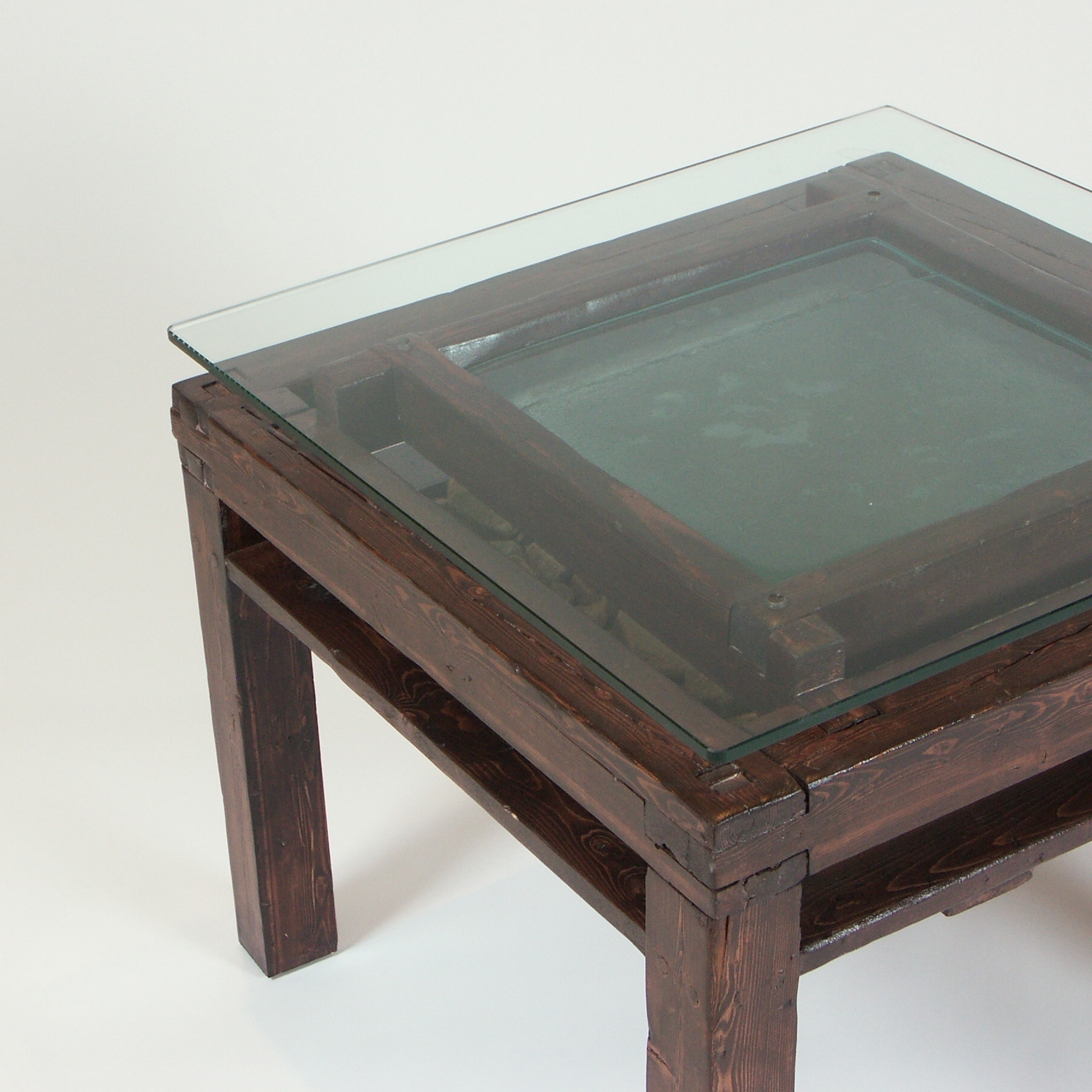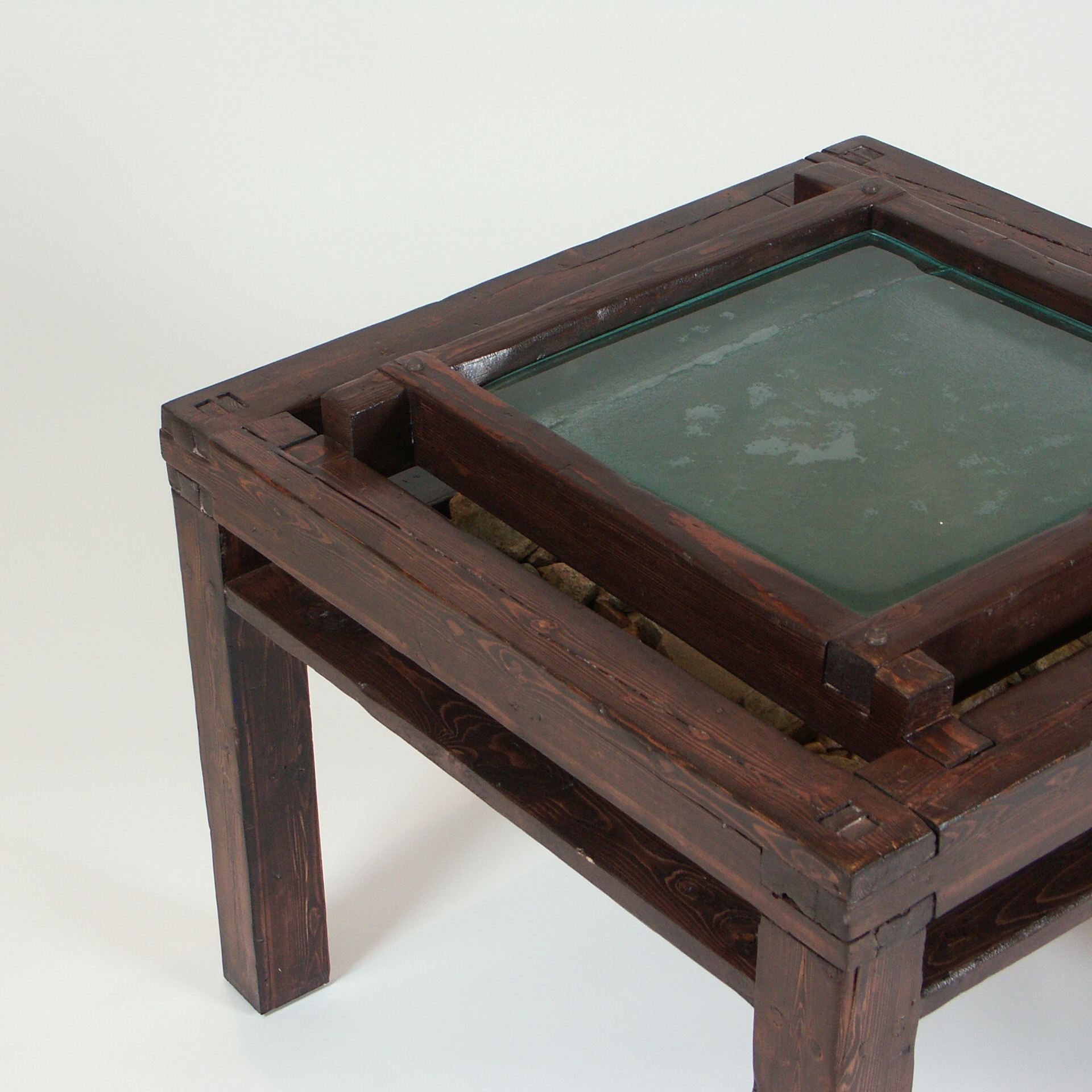 Reclaimed wood (pine), river stones, melted glass, glass top