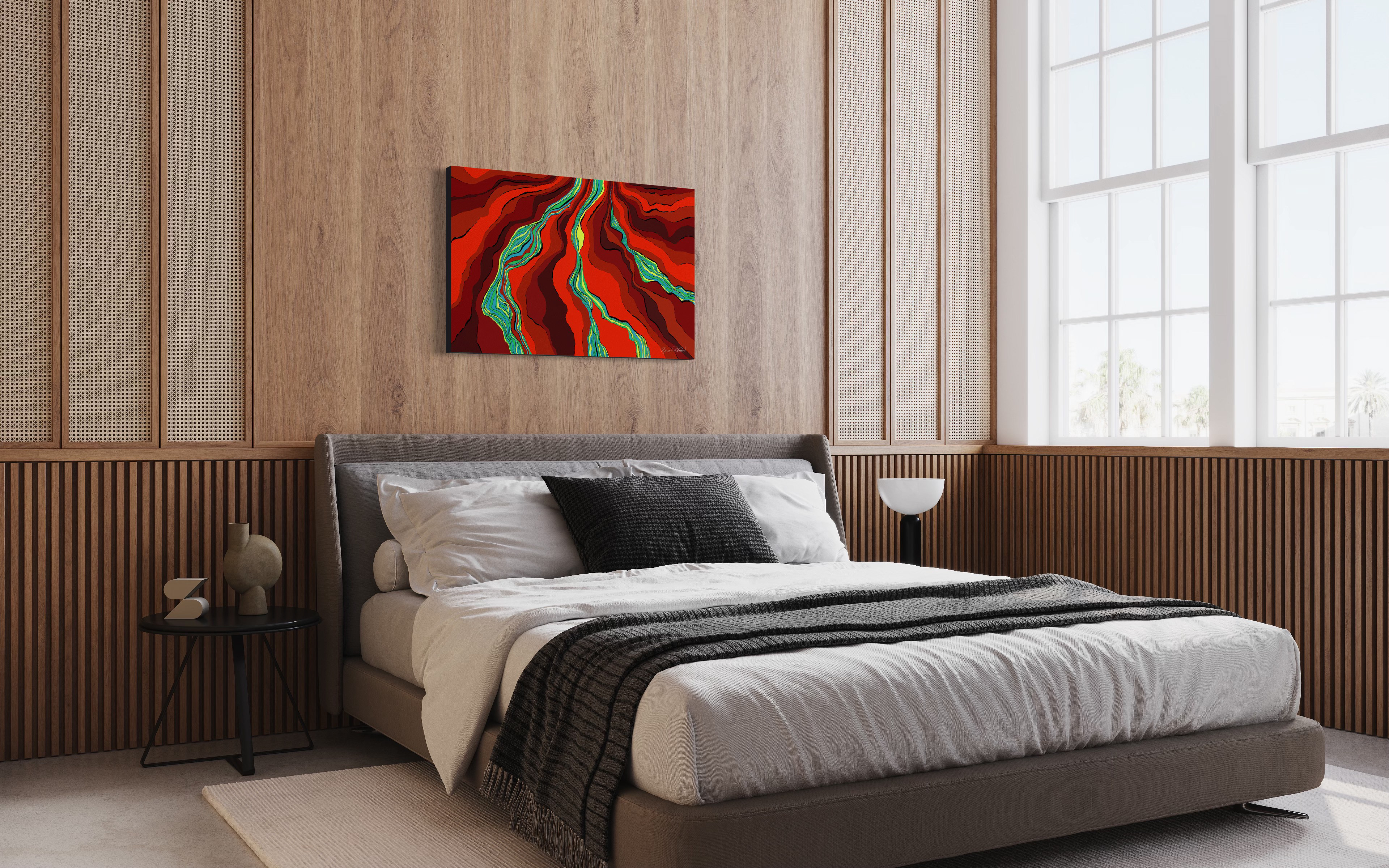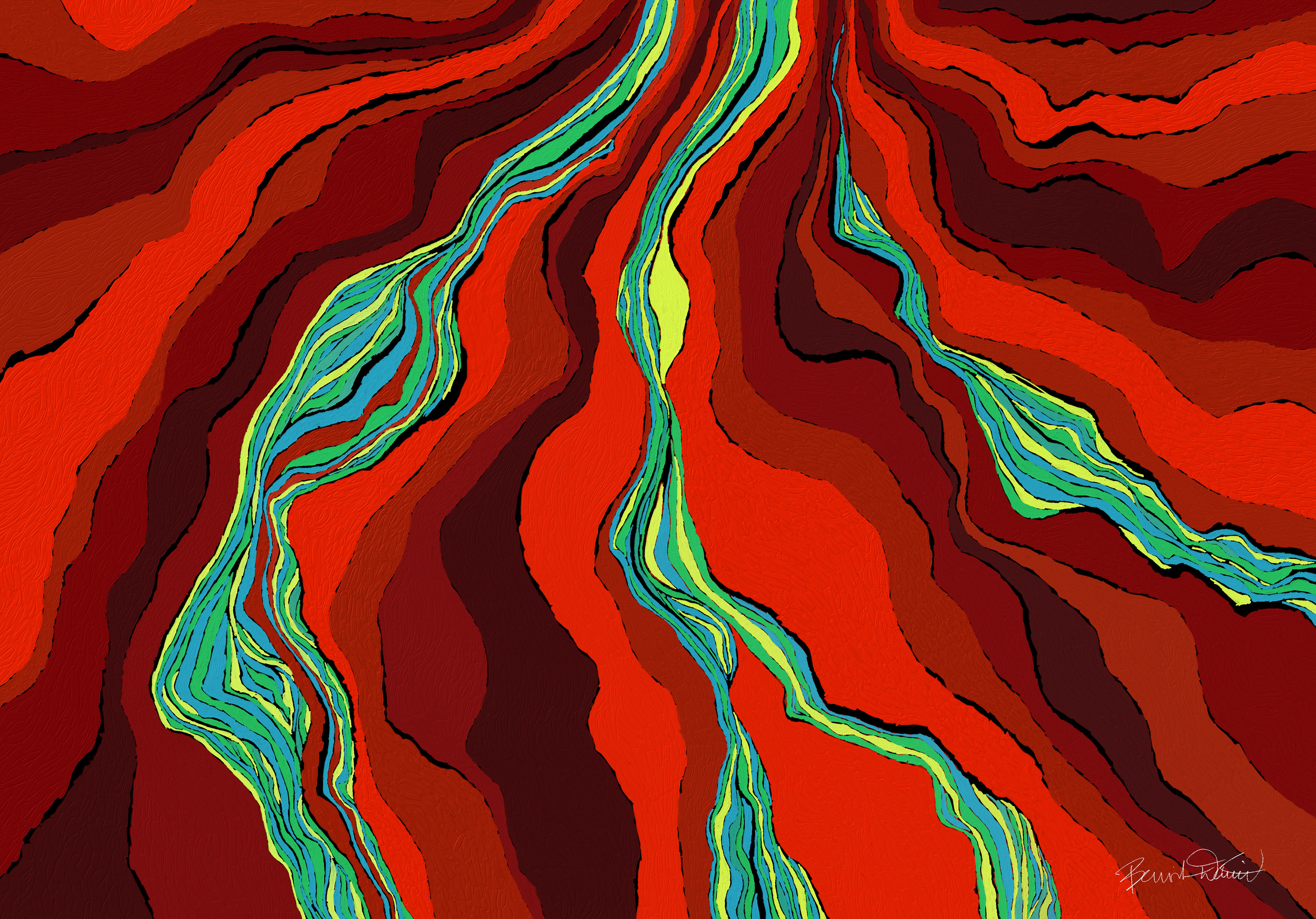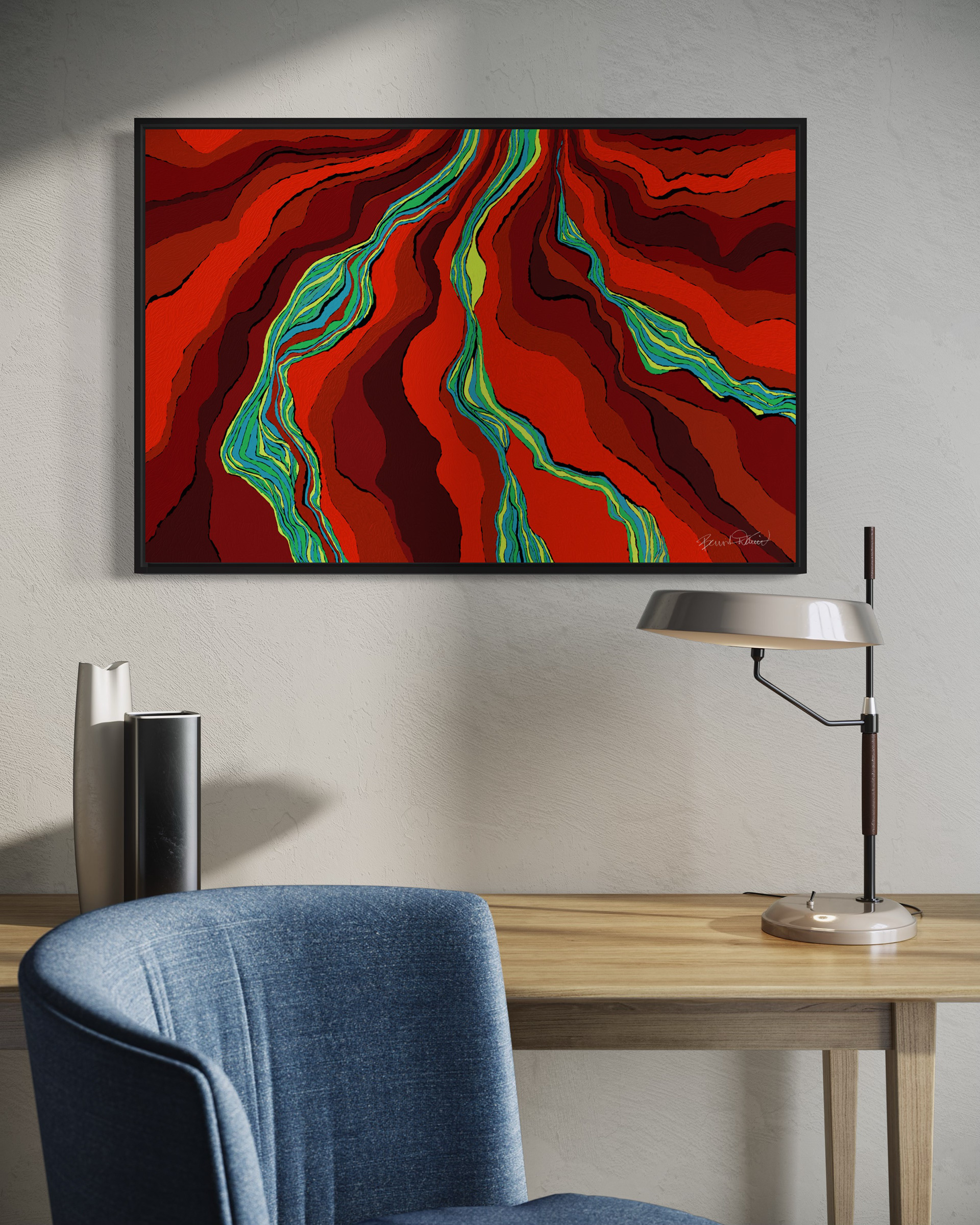 “River of Fiery Earth,” a digital art piece that captures the dynamic beauty of canyon-like landscapes from an aerial perspective. This 33 x 23-inch abstract composition features bold, flowing lines reminiscent of a river or lava stream carving through the earth. With a vibrant palette of reds, oranges, and browns complemented by bright green and aqua-blue streaks, the artwork creates a sense of depth and drama. The undulating patterns lend an organic, topographical feel, inviting you to explore the interplay of contrasting colors and shapes. I’m excited to share this piece with you and hope it evokes the same wonder and energy I experienced while creating it.